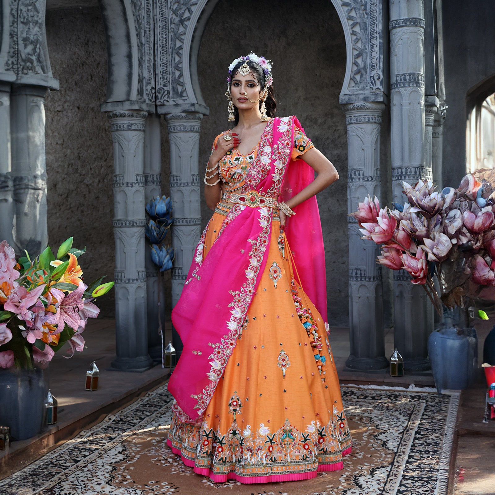 Color- Lehenga - Orange | Dupatta - Hot Pink